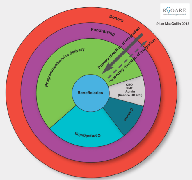 In Fig 7, the resource allocation and attraction markets are integrated and not only is the fundraising function integrated with the rest of the organisation, the vital role it performs is brought to the fore. Remove either of Fig 7’s two outer concentric rings (donors and fundraising), and the organisation ceases to exist.