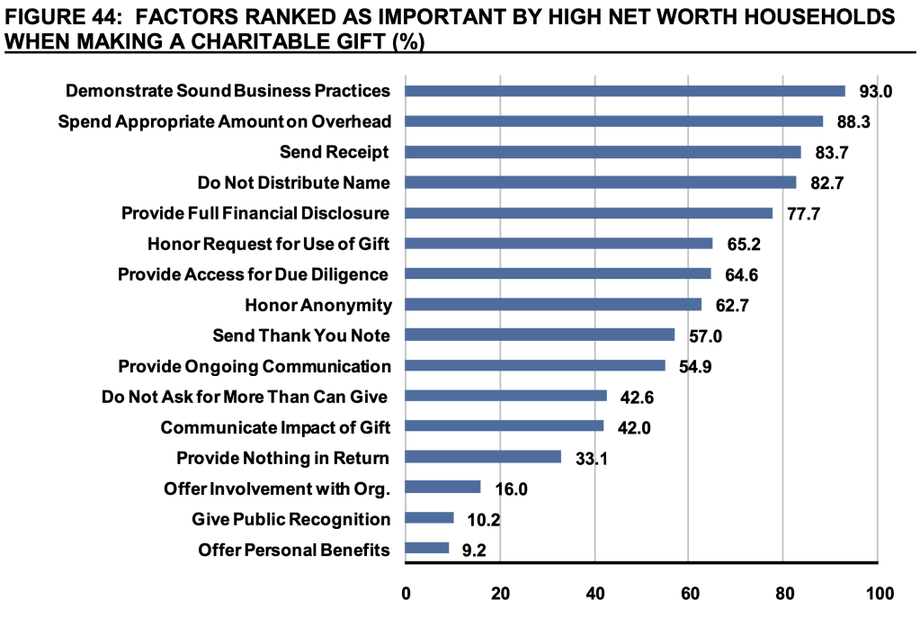 If donors want fundraisers to be more honest, upfront, straightforward and ‘professional’ in their dealing with them, then fundraisers have to be able to trust donors to be receptive to that heightened professionalism. Let’s not forget that a perennial complaint about fundraising is that it is too professional, and one of the main factors that concerns major donors (according to the Bank of American study on high net worth donors) are ‘inappropriate’ (i.e. high) operational costs.