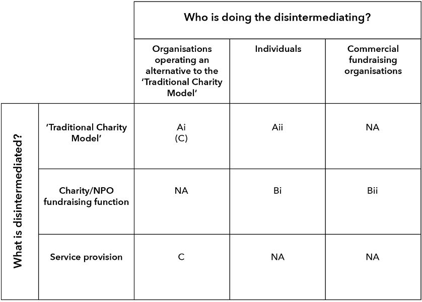Disintermediation occurs when charities/NPOs operating the ‘traditional charity model’ – those that mediate the transfer of resources from donors to beneficiaries, by turning resources (principally monetary donations) into goods and services to be used by beneficiaries – are disintermediated from this process (or part of it) and potentially replaced by a different entity, which might be individuals, commercial fundraising organisations, companies or non-traditional charities.